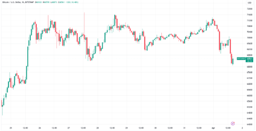 交易对在4月1日华尔街开盘时,BTC价格在试图重新测试68000美元支撑位时显现疲软,当日交易价格达66880美元。