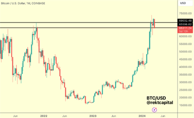 为避免进一步损失,比特币价格必须守住每周65600美元的支撑位。据统计,若比特币价格跌至65000美元,各交易所将清算超过2.49亿美元的长期杠杆头寸。