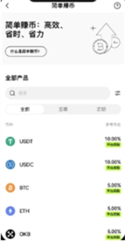 1.打开火必OKEX App,点击底部导航栏的【金融】选项,然后找到并点击【赚币】。在赚币专区中,选择【简单赚币】进入相关页面。