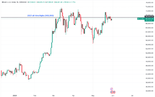 截至5月30日公布时,BTC的交易价格为68485美元,较过去24小时上涨了1.5%。市场正密切关注比特币是否能够成功突破其前一个历史高点,从而可能开启新一轮的价格发现。