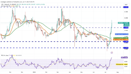 2024年7月17日,XRP币的开盘价为0.5241美元,随后在日内触及最高价0.5871美元,最低下探至0.5228美元,最终以0.5846美元收盘。该日24小时交易额为30.96亿美元,市值达到319.99亿美元。
