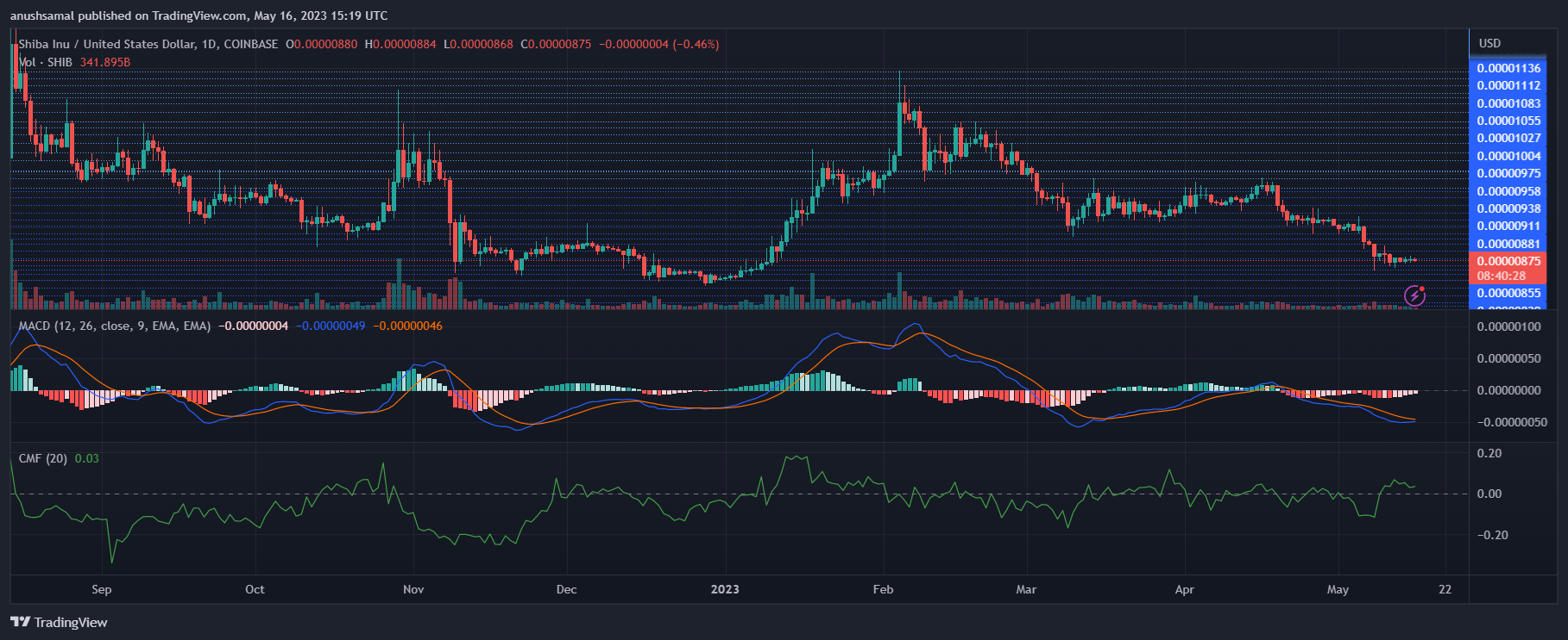 柴犬的价格一直在盘整,导致下跌趋势。在过去的24小时内,SHIB的价值下跌了2%,周线图上的走势有限。这表明购买兴趣下降和卖压增加。SHIB 市场出现超卖,但如果买家介入,价格仍有可能回升。购买活动的小幅增加可能导致 SHIB 在接下来的交易日大幅升值。